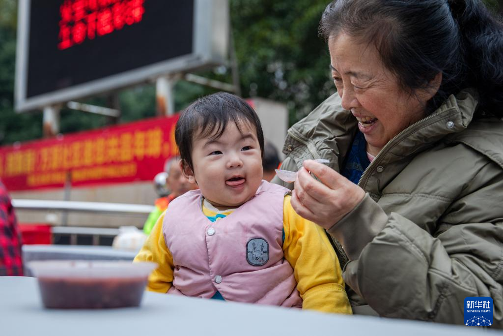 1月26日,小朋友在浙江省温州市鹿城区万源社区品尝腊八粥。