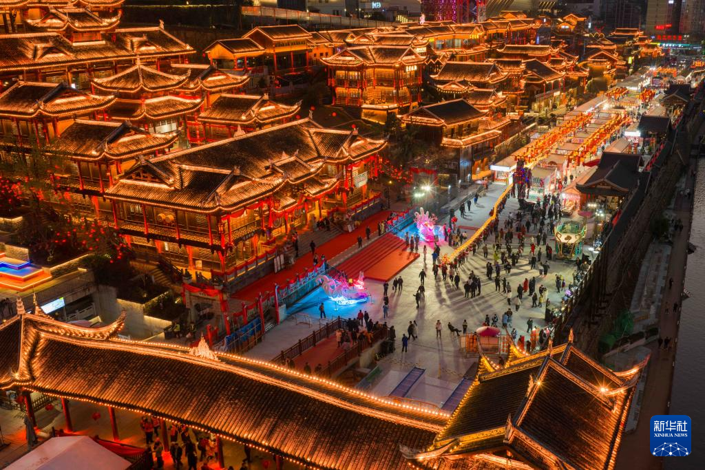 2月11日,市民和游客在四川省泸州市江阳区大梯步文化广场赏灯游玩。