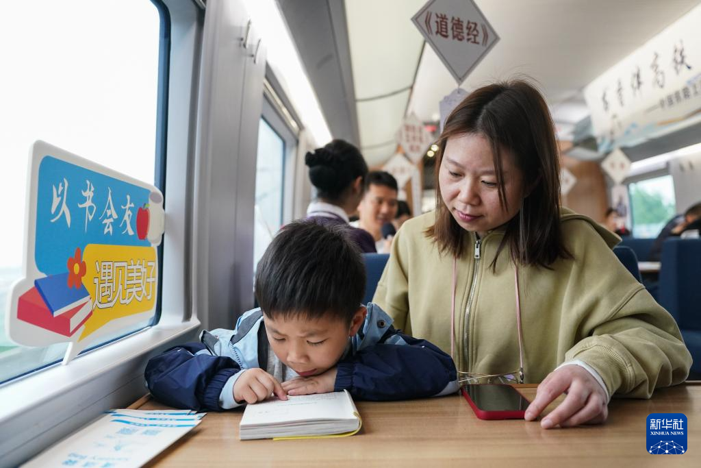 4月20日,一名小旅客在G7378次列车上举行的“书香伴高铁 阅读润旅途”列车阅读会上阅读。