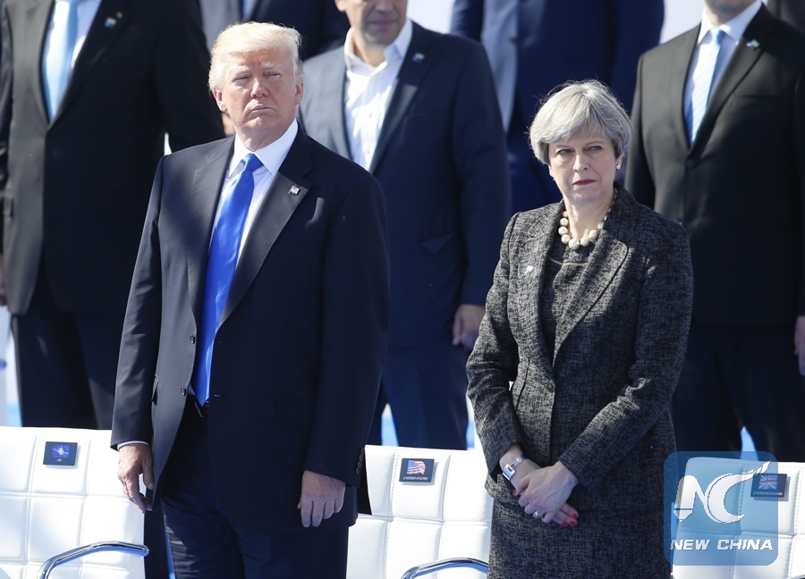 File Photo: U.S. President Donald Trump (L) and British Prime Minister Theresa May (R) attend the handover ceremony of the new NATO headquarters during a one-day NATO Summit, in Brussels, Belgium, May 25, 2017. (Xinhua/Ye Pingfan)