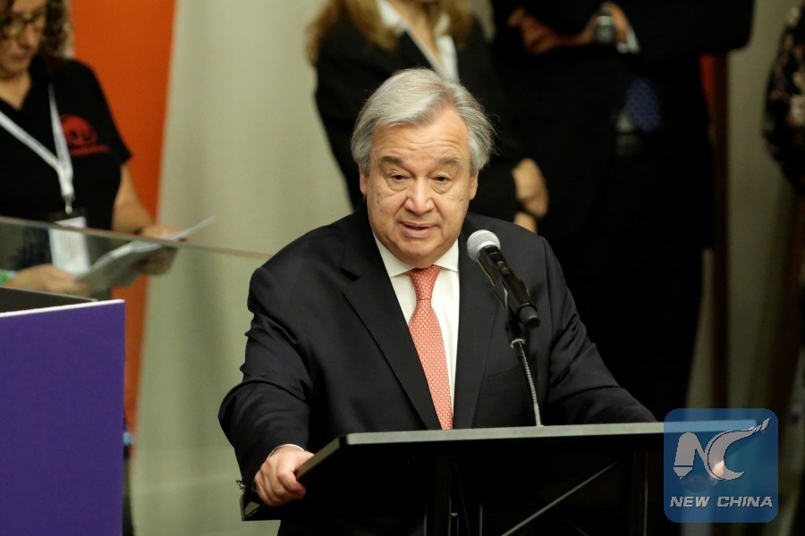 UN Secretary-General Antonio Guterres addresses a special event to mark World Children's Day at the United Nations headquarters in New York, on Nov. 20, 2017. UN Secretary-General Antonio Guterres on Monday deplored the fact that the world is letting children down by allowing them to go through hardships and suffering. (Xinhua/Li Muzi)