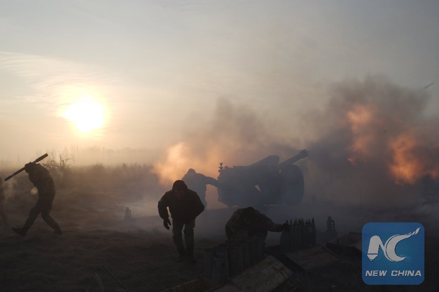 Ukrainian servicemen fire an artillery weapon in the direction of positions of the armed forces of the self-proclaimed Donetsk People's Republic near Novoluhanske in Donetsk region, Ukraine, January 11, 2018. (Xinhua/REUTERS)