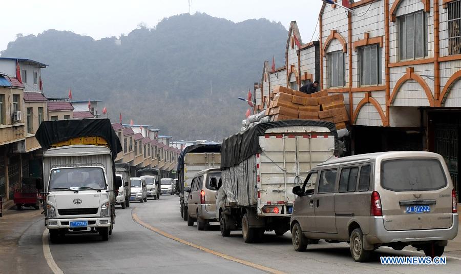 Foreign trade trucks are seen in Pingxiang City of south China's Guangxi Zhuang Autonomous Region, Jan. 16, 2018. By making full use of its geographical location and the potential of coastlines and border areas, Guangxi capitalized on its advantages and played a bigger role in the Belt and Road Initiative. Through ports and the Beibu Gulf Economic Zone, the trade cooperation between Guangxi and ASEAN countries gained great prospects. (Xinhua/Zhang Ailin)