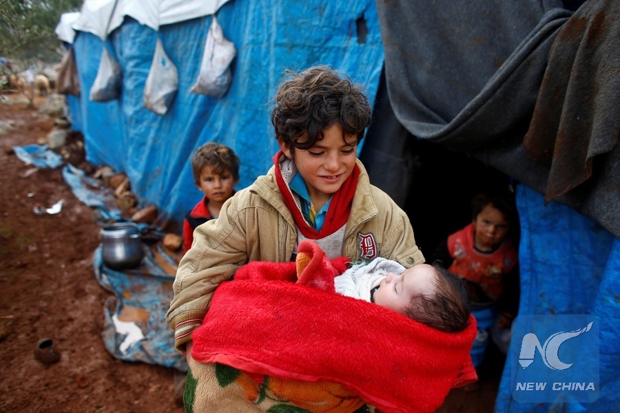 Displaced Syrian children stand outside of their tents at Kelbit refugeecamp, near the Syrian-Turkish border, in Idlib province, Syria Jan. 17, 2018. (Xinhua/REUTERS)