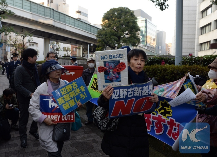 People hold placards against the decision from the top court outside Japan's top court building in Tokyo, Japan, Dec. 20, 2016. Japan's top court on Tuesday upheld a lower court's ruling in favor of the central government's plan to relocate a U.S. Marine Corps air base within the island prefecture of Okinawa, despite local people's demands that the U.S. base be relocated outside the prefecture. (Xinhua/Ma Ping)
