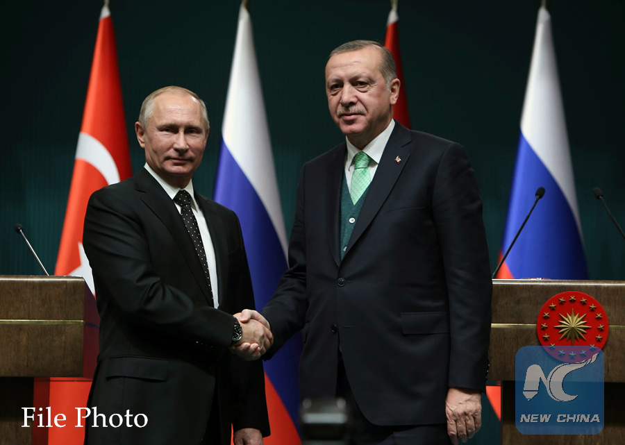 Turkish President Recep Tayyip Erdogan (R) shakes hands with his Russian counterpart Vladimir Putin during a joint press conference in Ankara, Turkey, on Dec. 11, 2017. (Xinhua/Mustafa Kaya)