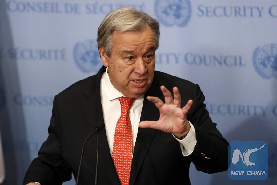 File Photo: United Nations Secretary-General Antonio Guterres speaks during a brief statement to reporters at the UN headquarters in New York, on Feb. 2, 2018. UN Secretary-General Antonio Guterres welcomed the outcome of the intra-Syria talks in Russian Black Sea resort of Sochi, saying Russia kept its word that the Sochi talks would be a contribution to the UN-led Geneva process. (Xinhua/Li Muzi)