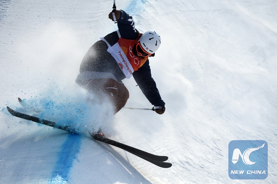 Aaron Blunck of the U.S. competes during men's ski halfpipe qualification of freestyle skiing at the 2018 PyeongChang Winter Olympic Games at Phoenix Snow Park, PyeongChang, South Korea, Feb. 20, 2018. (Xinhua/Lui Siu Wai)