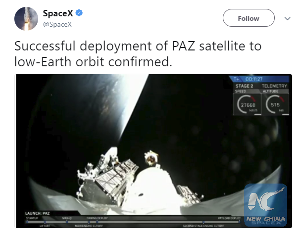 "Successful deployment of PAZ satellite to low-Earth orbit confirmed," the California-based company tweeted.