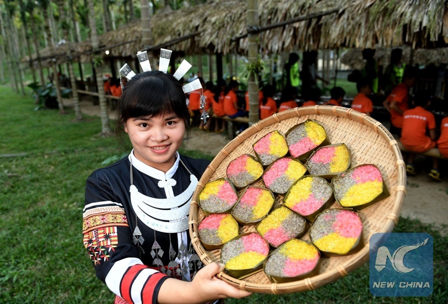A girl of Li ethnic group shows local snack of three-color rice in Xiaomei Village, Lingshui Li Autonomous County, south China's Hainan Province, Jan. 21, 2018. After local government's targeted measures in poverty alleviation work, the improved environment in Xiaomei Village, once an impoverished village, now attract more tourism business for local people. (Xinhua/Zhao Yingquan)