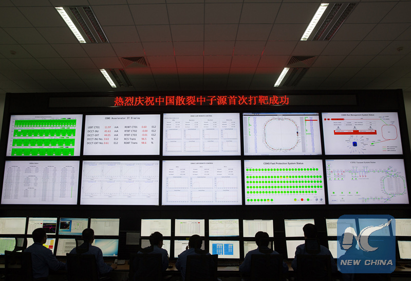 File photo shows engineers work at the control room of circular accelerator for the China Spallation Neutron Source (CSNS) in Dongguan, south China's Guangdong Province, Sept. 1, 2017.