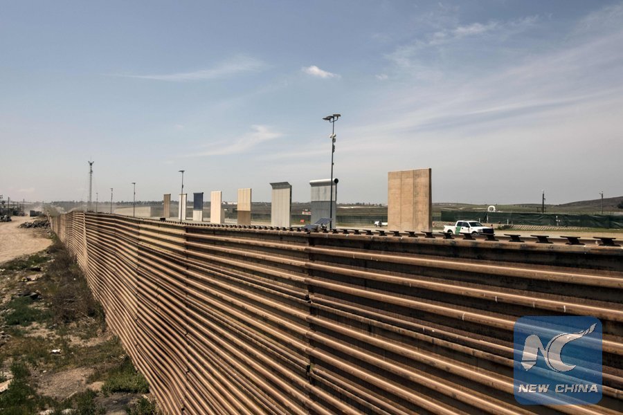 A U.S. border patrol truck is seen next to U.S. President Donald Trump's border wall prototypes from the U.S.-Mexico border in Tijuana, northwestern Mexico, on April 3, 2018. (Xinhua/AFP )