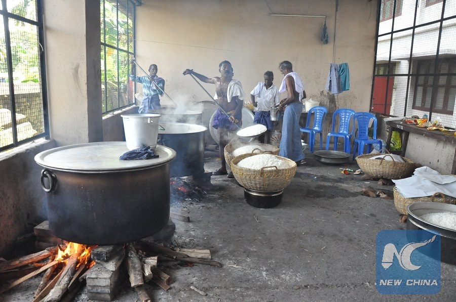 Food being prepared inside a relief camp in the 'Parumala Seminary' in India's flood-hit state Kerala's Chengannur area for nearly 3500 flood victims who are staying here after being rendered homeless in the deluge on August 22, 2018. (Xinhua/Stringer)