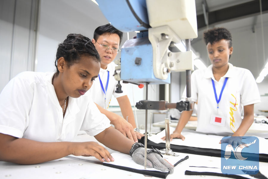 An Ethiopian worker of ANTEX Fashion Group learns sewing skill at a plant in Huzhou, east China's Zhejiang Province, Aug. 30, 2018. (Xinhua)