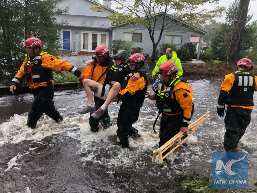 WASHINGTON, Sept. 14 (Xinhua) -- At least five people have been killed so far in the aftermath of Hurricane Florence which was downgraded Friday afternoon to a tropical storm with winds of 70 mph (110 km/h) along the U.S. East Coast.