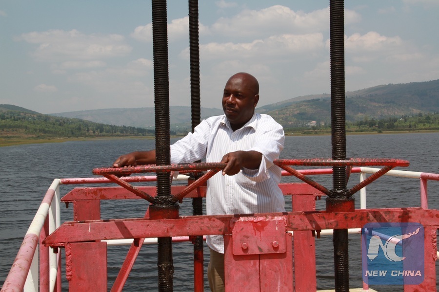 Jean de Dieu Mugiraneza, an engineer of Rwandan government's Rural Sector Support Project, demonstrates dam valve operation in Eastern province, Rwanda, July 13, 2018. Chinese companies have played a vital role in enabling Rwandan farmers to increase agricultural productivity and household incomes, a Rwandan analyst said. (Xinhua/Zhang Gaiping)