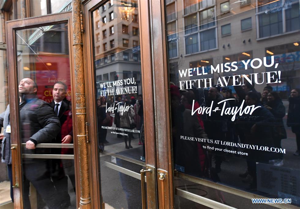A security guard closes the door of the flagship store of the famous department store chain Lord & Taylor on Fifth avenue in Manhattan, New York, the United States, Jan. 2, 2019. The famous department store chain Lord & Taylor officially closed its flagship store on Fifth avenue in Manhattan, New York City. (Xinhua/Li Rui)??