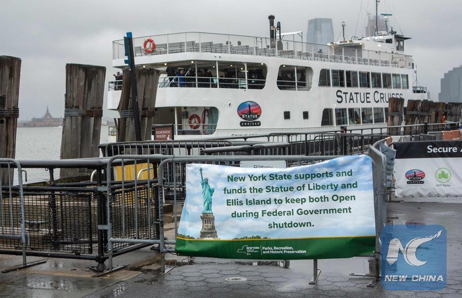 The Statue of Liberty and Ellis Island ferry transports passengers on January 5, 2019, in New York, as the US governmentshutdown enters its third week. - New York state funds are being used to keep the attractions open during the shutdown which has affected U.S. National Parks. (Xinhua/AFP)