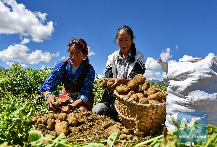 Farmers sort potatoes in Donggar Town of Doilungdeqen County, southwest China's Tibet Autonomous Region, Sept. 5, 2018. (Xinhua/Zhang Rufeng)