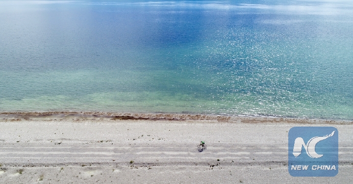 A cyclist rides during a cycling race around the holy lake Mapham Yutso in Pulan County of Ngari Prefecture, southwest China's Tibet Autonomous Region, Sept. 9, 2018. (Xinhua/Purbu Zhaxi)