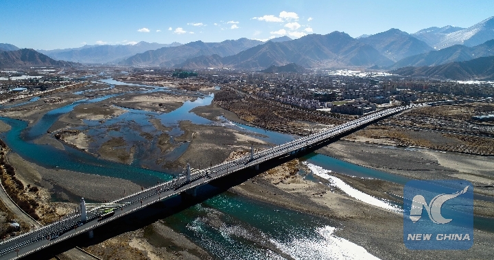 Aerial photo taken on March 4, 2018 shows a newly-built bridge across the Lhasa River, a tributary of the Yarlung Zangbo River, in southwest China's Tibet Autonomous Region. (Xinhua/Jigme Dorje)