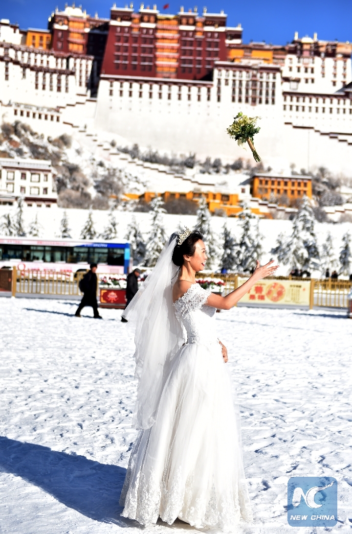 A woman poses for wedding photos at the snow-covered Potala Palace square in Lhasa, capital of southwest China's Tibet Autonomous Region, Dec. 19, 2018. (Xinhua/Chogo)