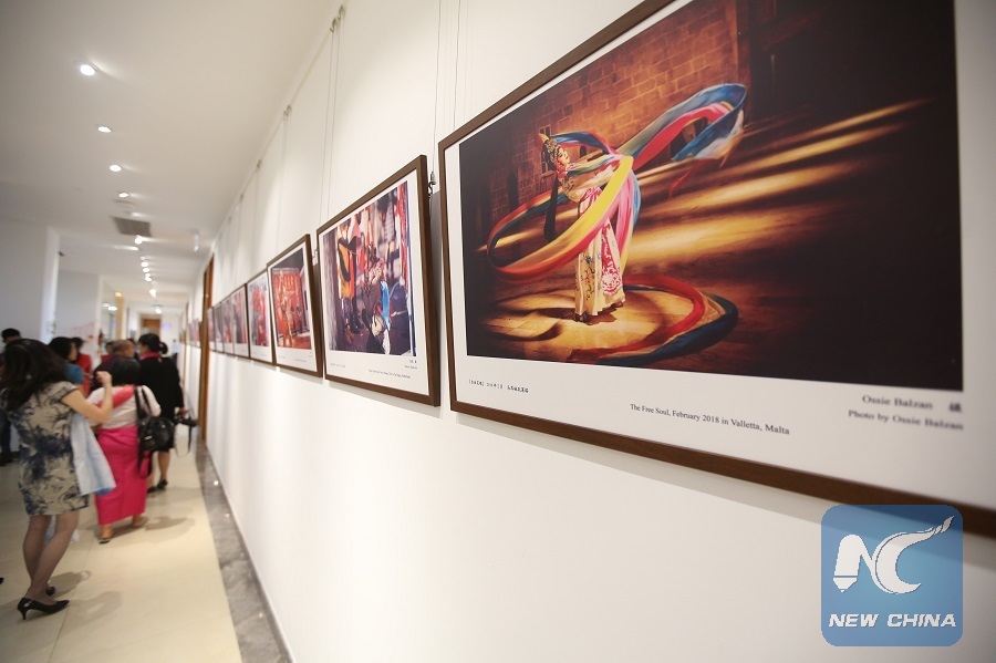 Visitors look at photos during the opening ceremony of the Exhibition of Intangible Cultural Heritage in Yunnan Province of China and Happy Chinese New Year Photo Exhibition at the China Cultural Center in Yangon, Myanmar, Jan. 29, 2019. (Xinhua/U Aung)
