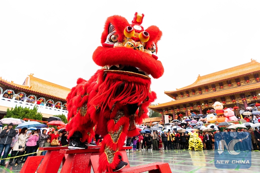 People watch lion dance on the first day of the Chinese Lunar New Year at the Hsi Lai Temple in Los Angeles County, the United States, on Feb. 5, 2019. (Xinhua/Qian Weizhong)