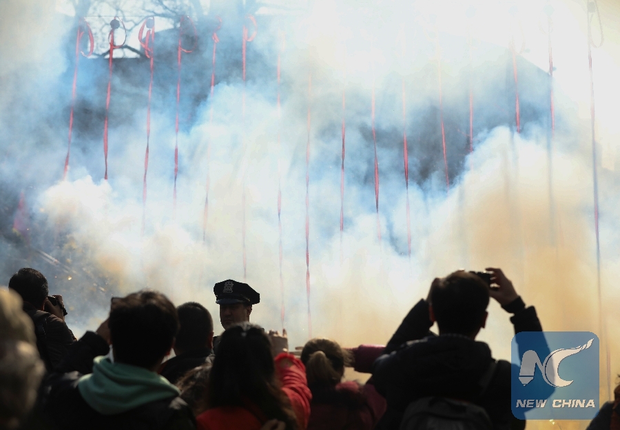 People watch the firecracker ceremony during the 20th New Year Firecracker Ceremony & Cultural Festival in lower Manhattan of New York, the United States, Feb. 5, 2019. (Xinhua/Wang Ying)