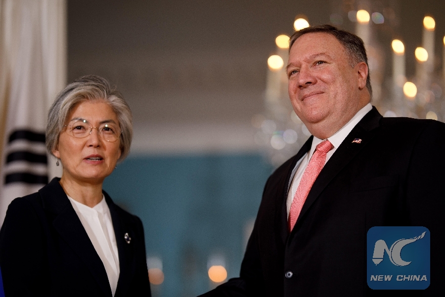 File Photo: U.S. Secretary of State Mike Pompeo (R) meets with South Korean Foreign Minister Kang Kyung-wha at the U.S. Department of State in Washington D.C., the United States, on Dec. 6, 2018. (Xinhua/Ting Shen)