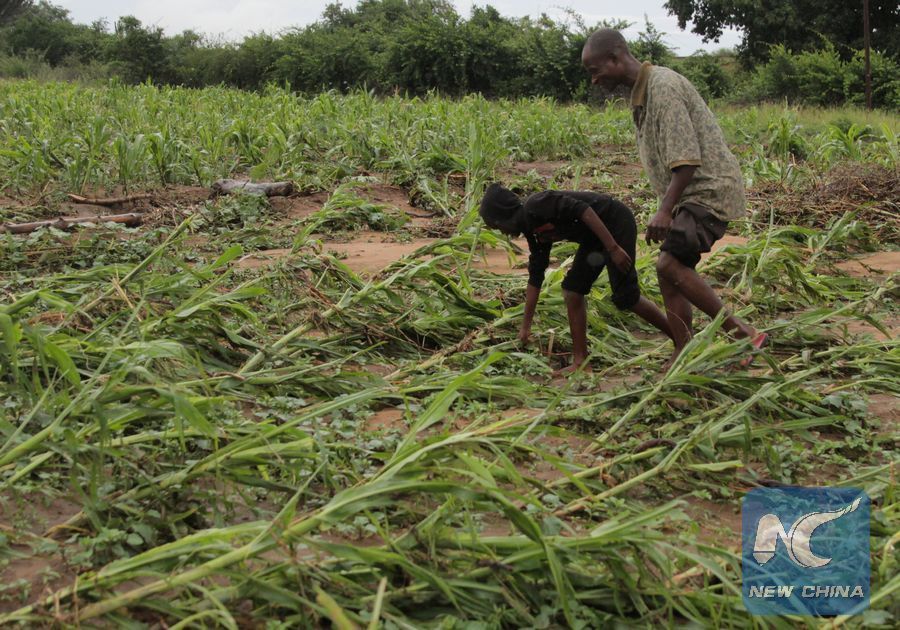 Farmers check their crop after the area was hit by cyclone Idai in Chimanimani, Manicaland Province, Zimbabwe, March 17, 2019. (Xinhua/Shaun Jusa)