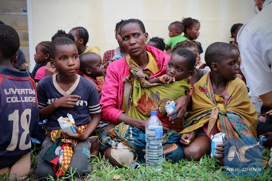 Displaced people sit with as they received food drink after arriving at the airport of the coastal city of Beira in central Mozambique on March 19, 2019, after the area was hit by the Cyclone Idai. (AFP Photo)