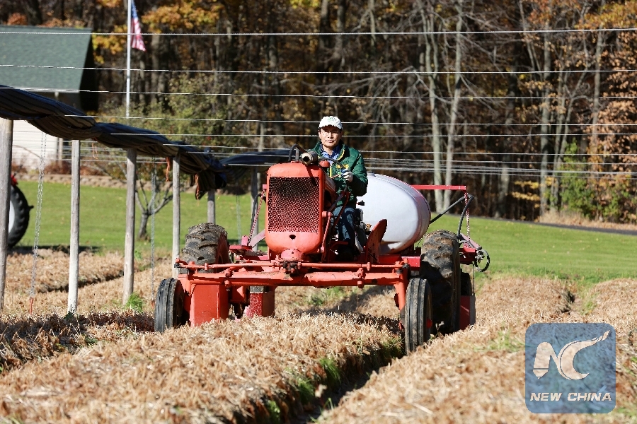 Jiang Mingtao, founder of Marathon Ginseng International Inc., drives a tractor at a ginseng farm in Marathon County, Wisconsin, the United States, in this Oct. 22, 2018 file photo. (Xinhua/Wang Ping)