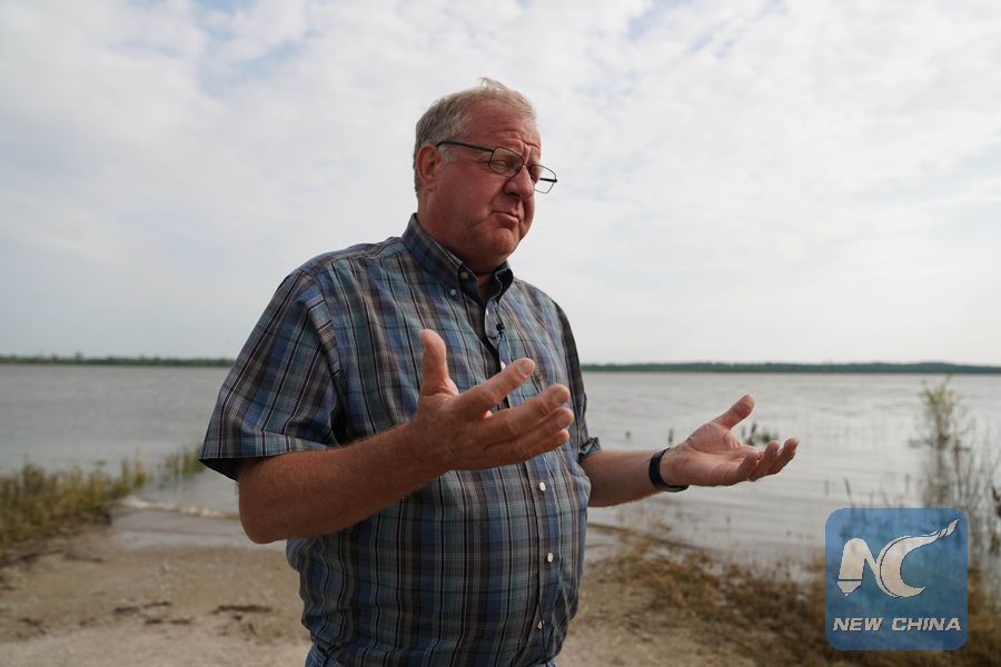 Tom Waters, a seventh-generation farmer, speaks during an interview near his rain-soaked fields in Orrick, Missouri, the United States, on June 9, 2019.(Xinhua/Liu Jie)