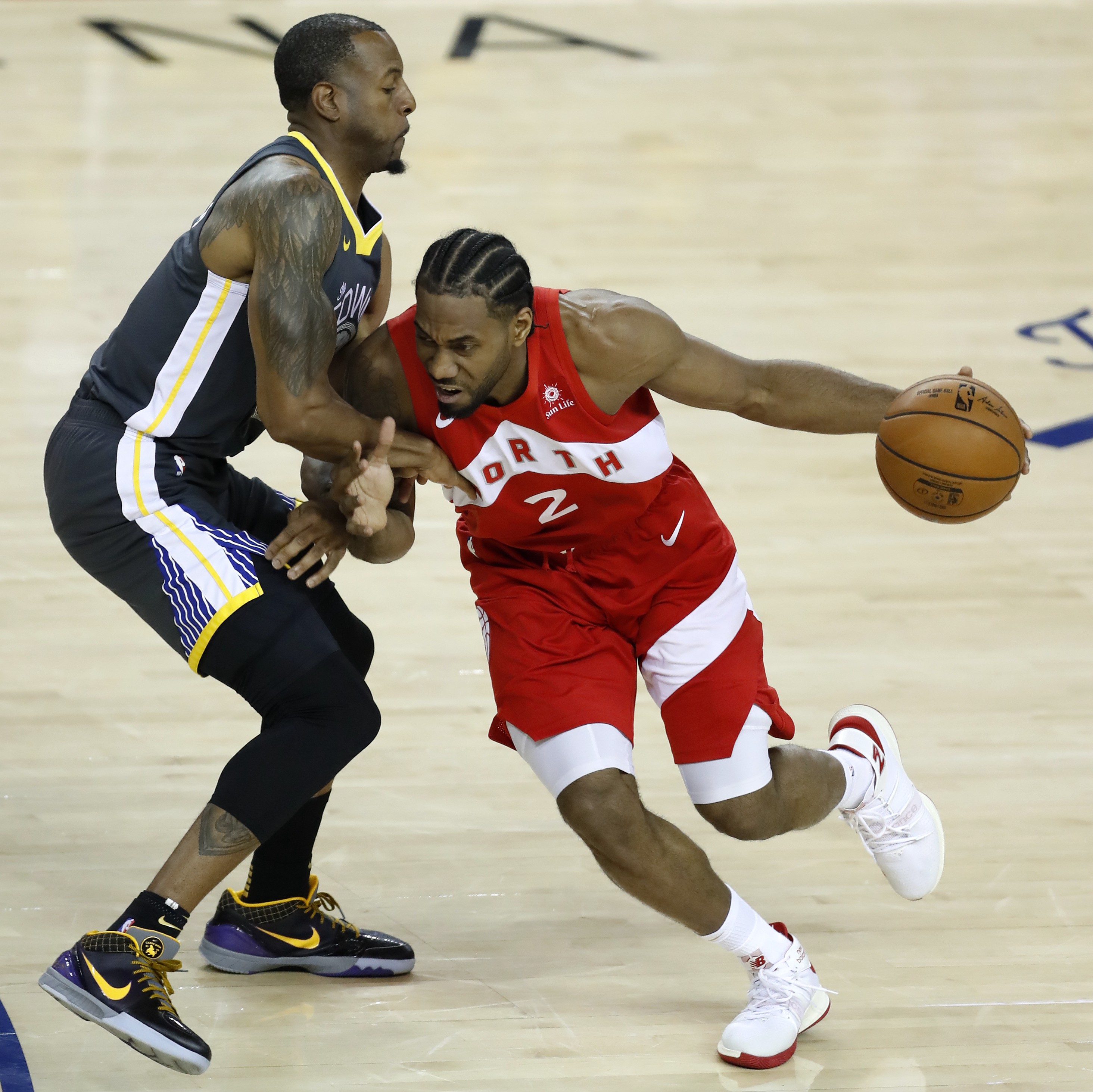 Kawhi Leonard (R) is defended by Andre Iguodala (L) in the NBA Finals game 6 between the Toronto Raptors and the Golden State Warriors at Oracle Arena, in Oakland, California, June 13, 2019. (Xinhua/Dong Xudong)