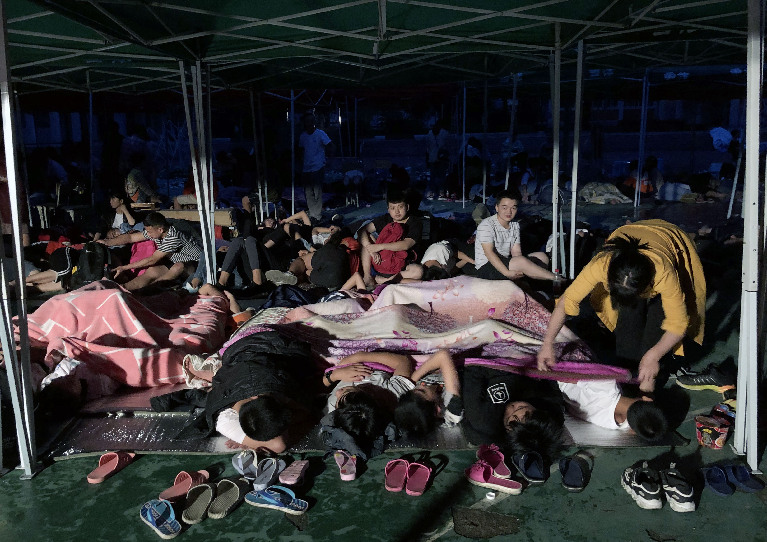 A teacher tucks students in bed at a tent in the playground of Shuanghe Town High School in Changning County of Yibin City, southwest China's Sichuan Province, June 18, 2019. (Xinhua)