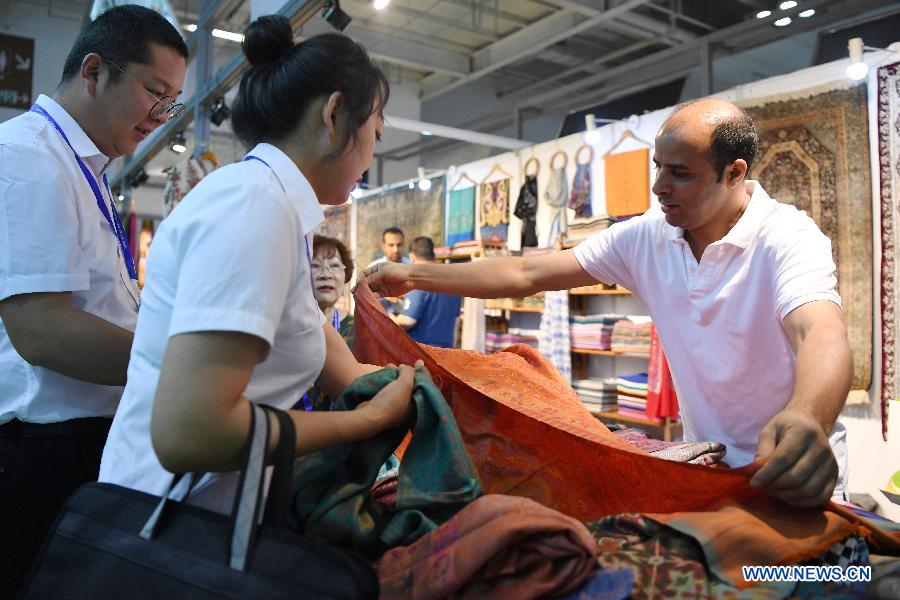 An Indian exhibitor introduces goods to guests during the Lanzhou Investment & Trade Fair in Lanzhou, capital of northwest China's Gansu Province, July 4, 2019. The fair opened here on Thursday, and will last for five days. (Xinhua/Chen Bin)