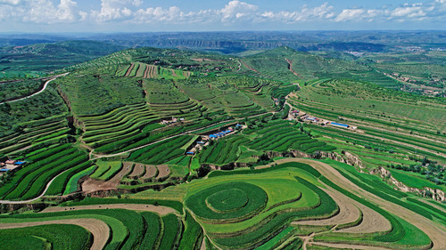 Aerial photo taken on July 16, 2018 shows the scenery of a terrace park in Pengyang County of Guyuan City, northwest China's Ningxia Hui Autonomous Region. (Xinhua/Wang Peng)
