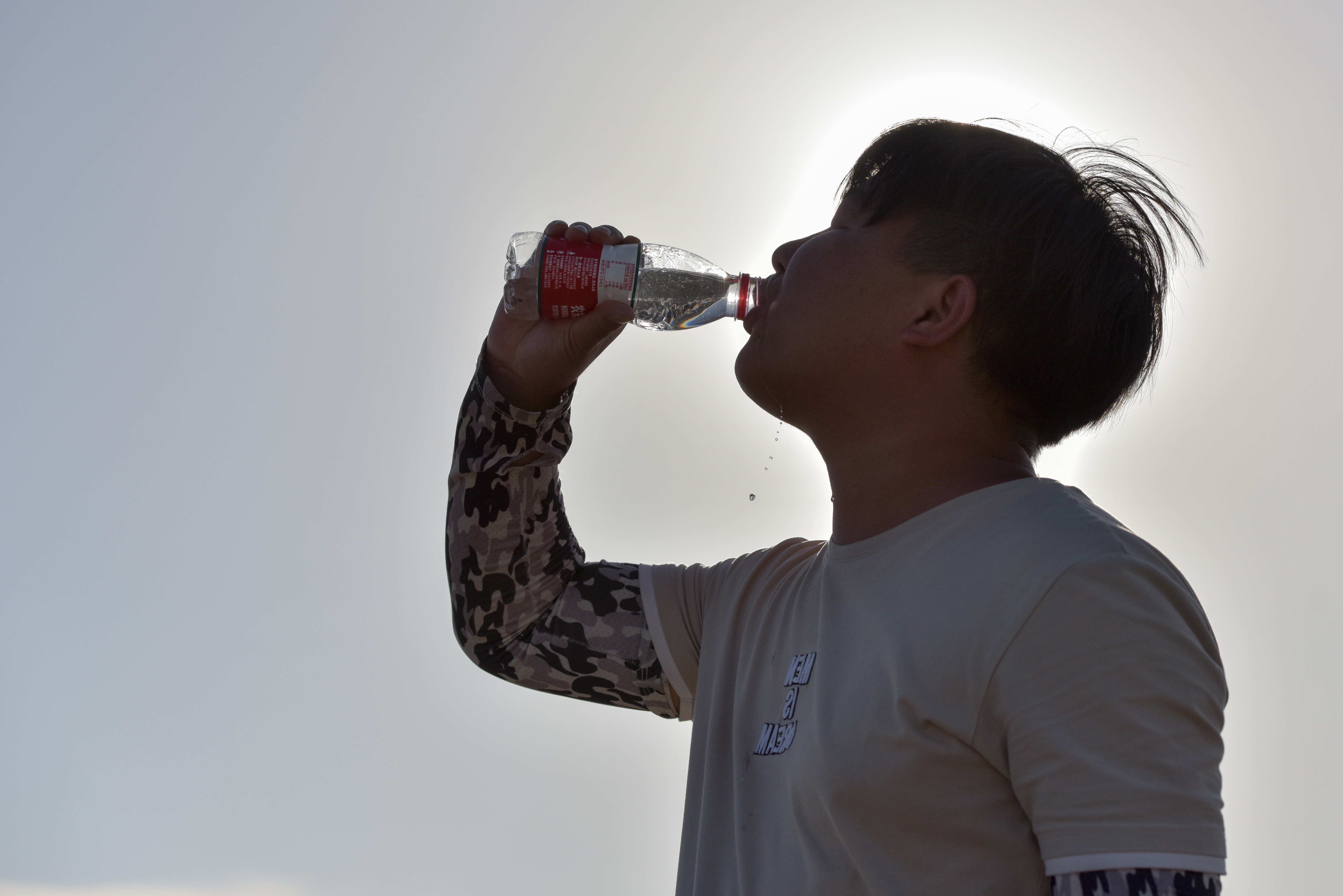 Inspector You Liwu drinks water to cool himself at an outside test area of the Xinjiang Turpan Natural Environment Experimental Research Center in Turpan, northwest China's Xinjiang Uygur Autonomous Region, July 17, 2019.(Xinhua/Ding Lei)