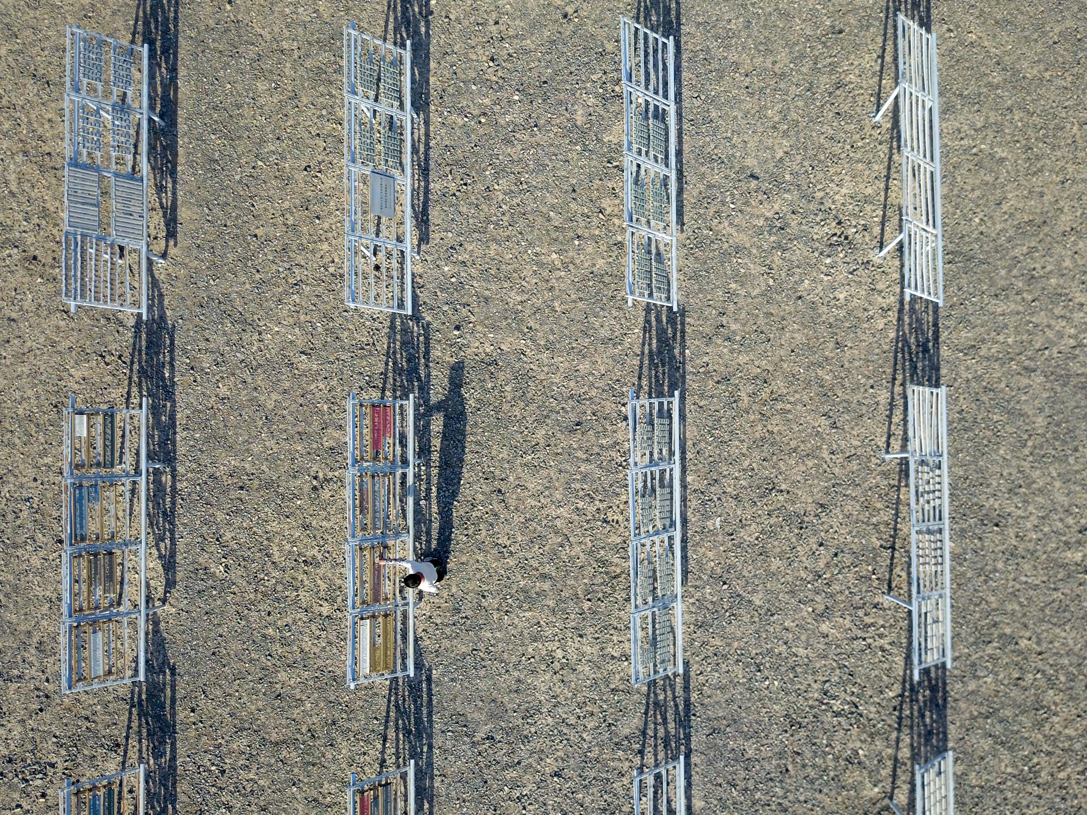 Aerial photo shows inspector You Liwu maintaining test items at an outside test area of the Xinjiang Turpan Natural Environment Experimental Research Center in Turpan, northwest China's Xinjiang Uygur Autonomous Region, July 17, 2019. (Xinhua/Ding Lei)