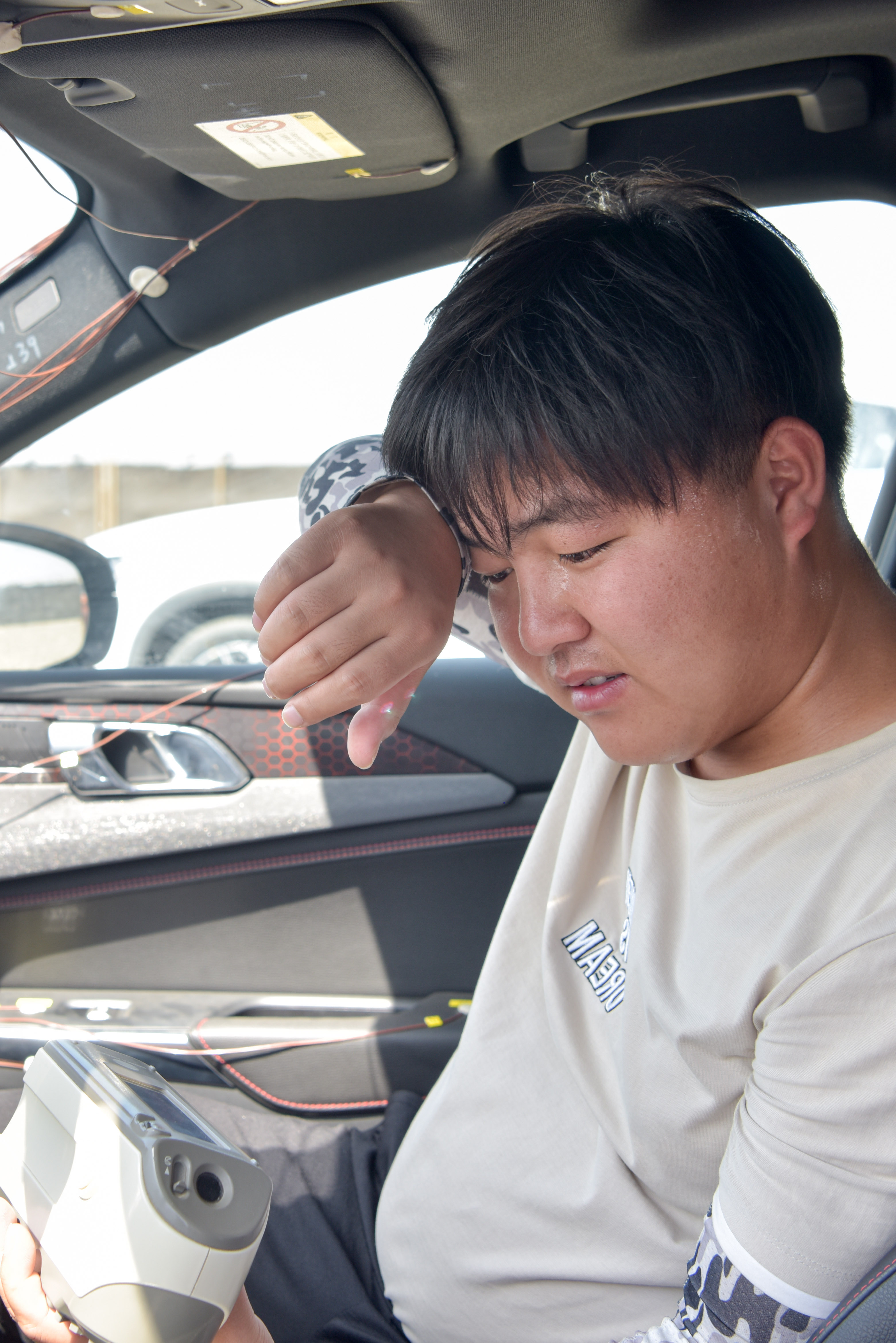Inspector You Liwu tests chromatic aberration of vehicle interior trimmings at a vehicle test area of the Xinjiang Turpan Natural Environment Experimental Research Center in Turpan, northwest China's Xinjiang Uygur Autonomous Region, July 17, 2019. (Xinhua/Ding Lei)