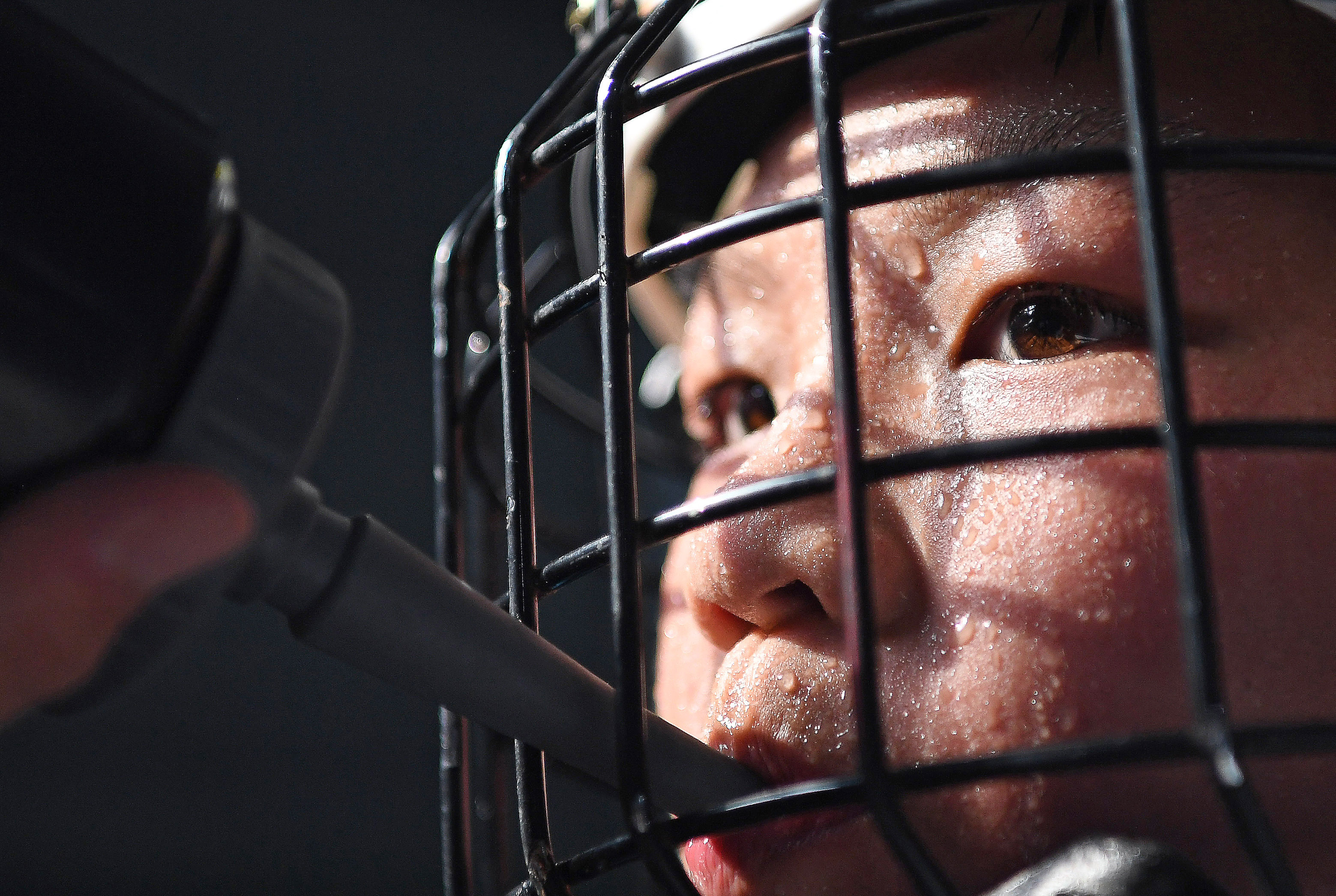 Chen Tao (C) of Shicheng Ice Hockey Team drinks during the break of training in Shicheng, Ganzhou City of east China's Jiangxi Province. (Xinhua/Wan Xiang)