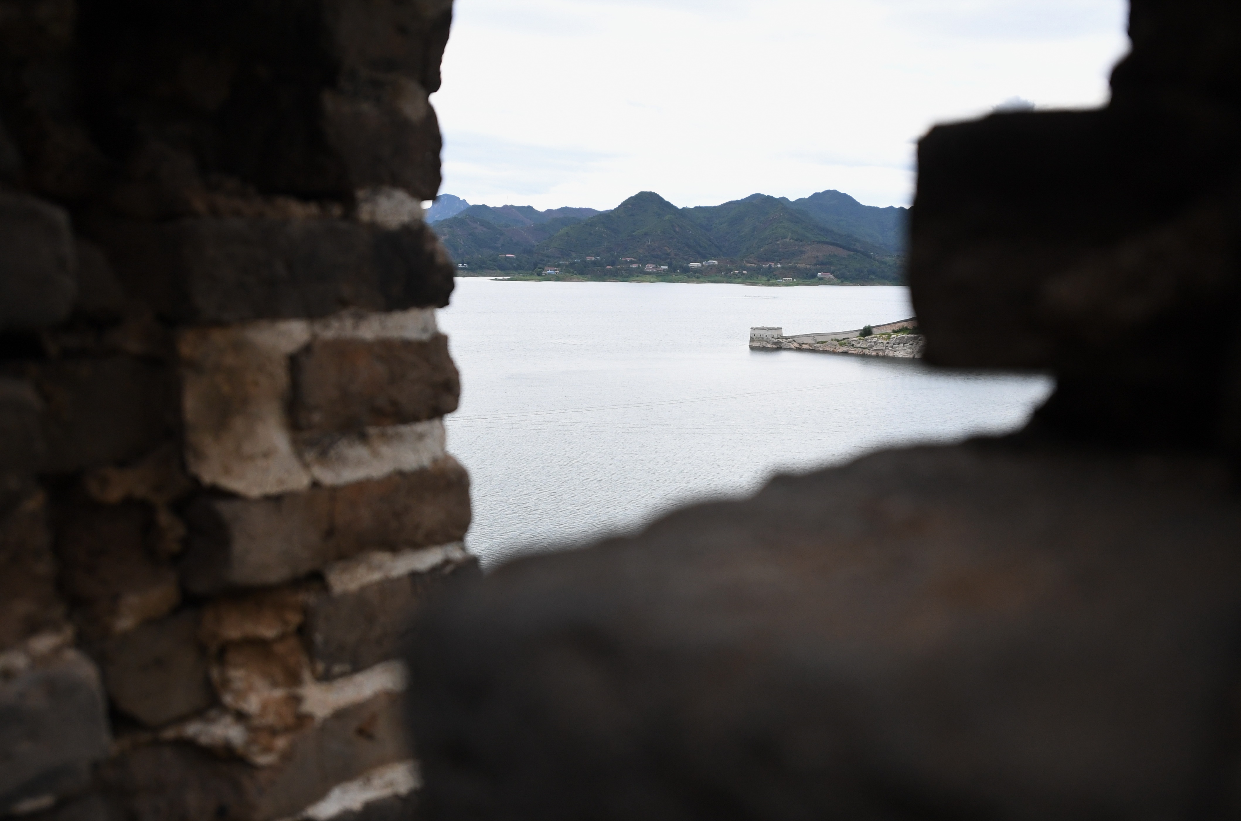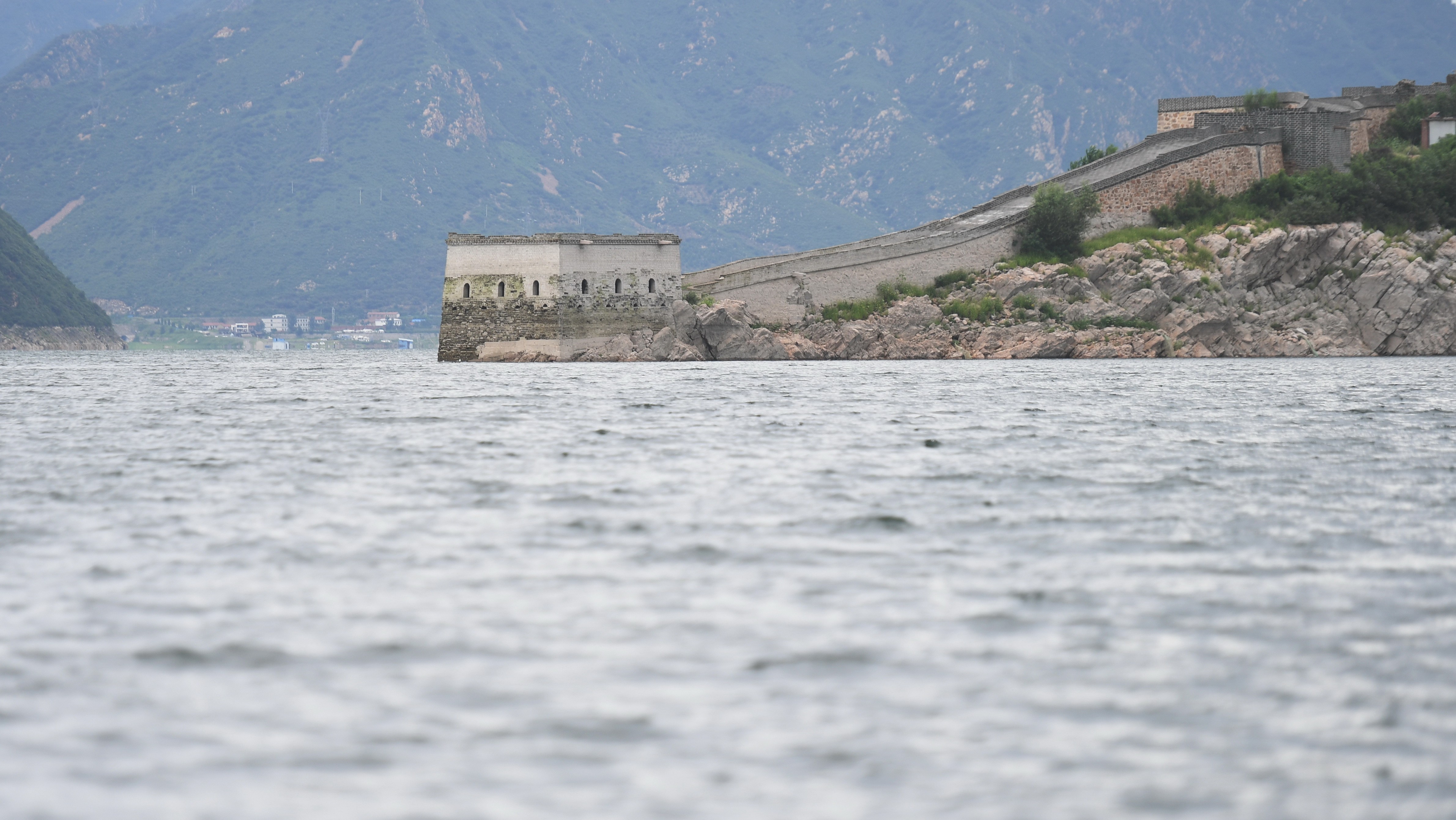 Photo taken on Aug. 13, 2019 shows a section of the Great Wall in Panjiakou reservoir in north China's Hebei Province. (Xinhua/Gong Zhihong)