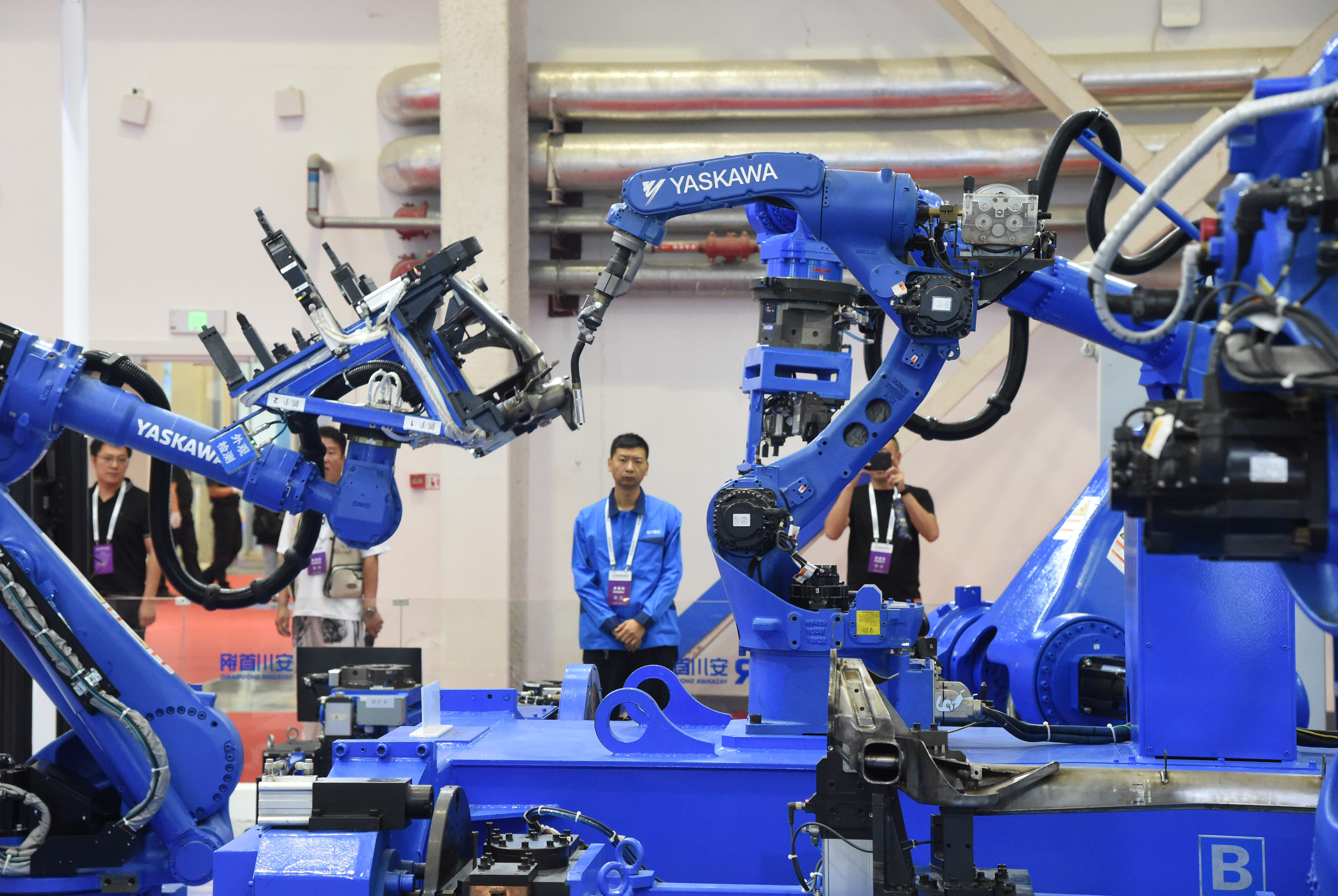 Industrial robots at the 2019 World Robot Conference in Daxing District of Beijing. (Xinhua/Ren Chao)