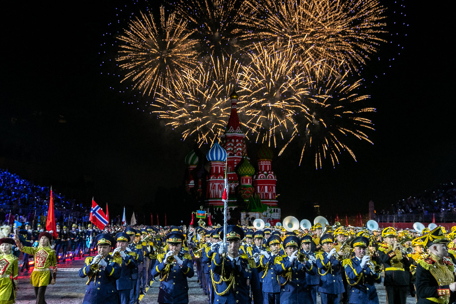 Fireworks are seen during the opening day of "Spasskaya Tower" International Military Music Festival in Moscow, Russia, on Aug. 23, 2019. (Xinhua/Bai Xueqi)