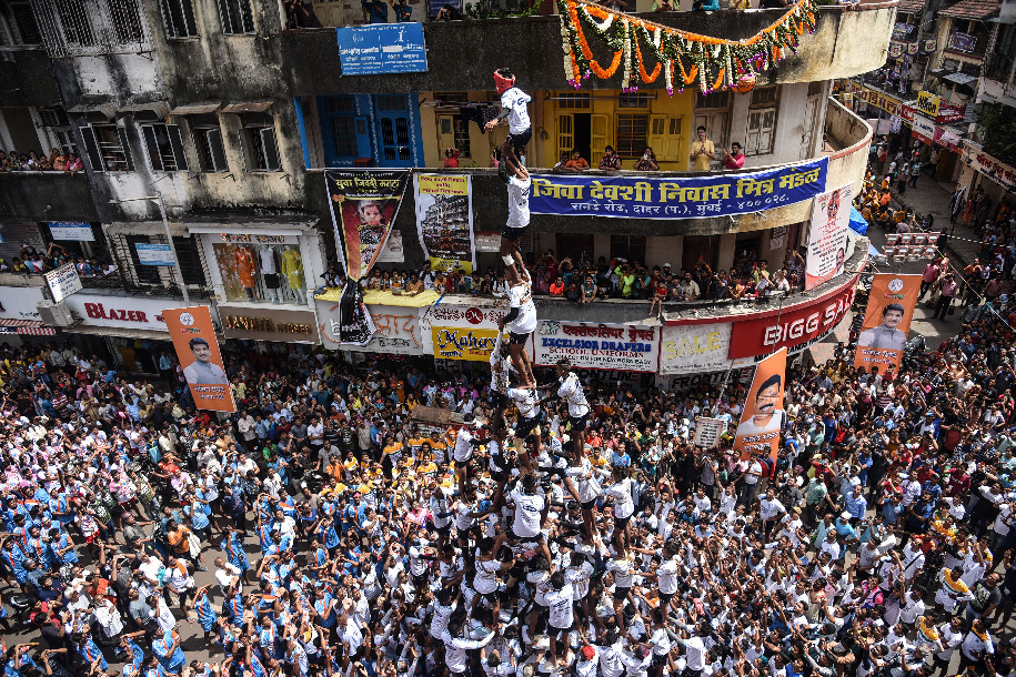 Indian devotees form a human pyramid in an attempt to reach and break a 'dahi-handi' (curd-pot) during the Janmashtami Festival in Mumbai, India, Aug. 24, 2019. (Photo by Fariha Farooqui/Xinhua)
