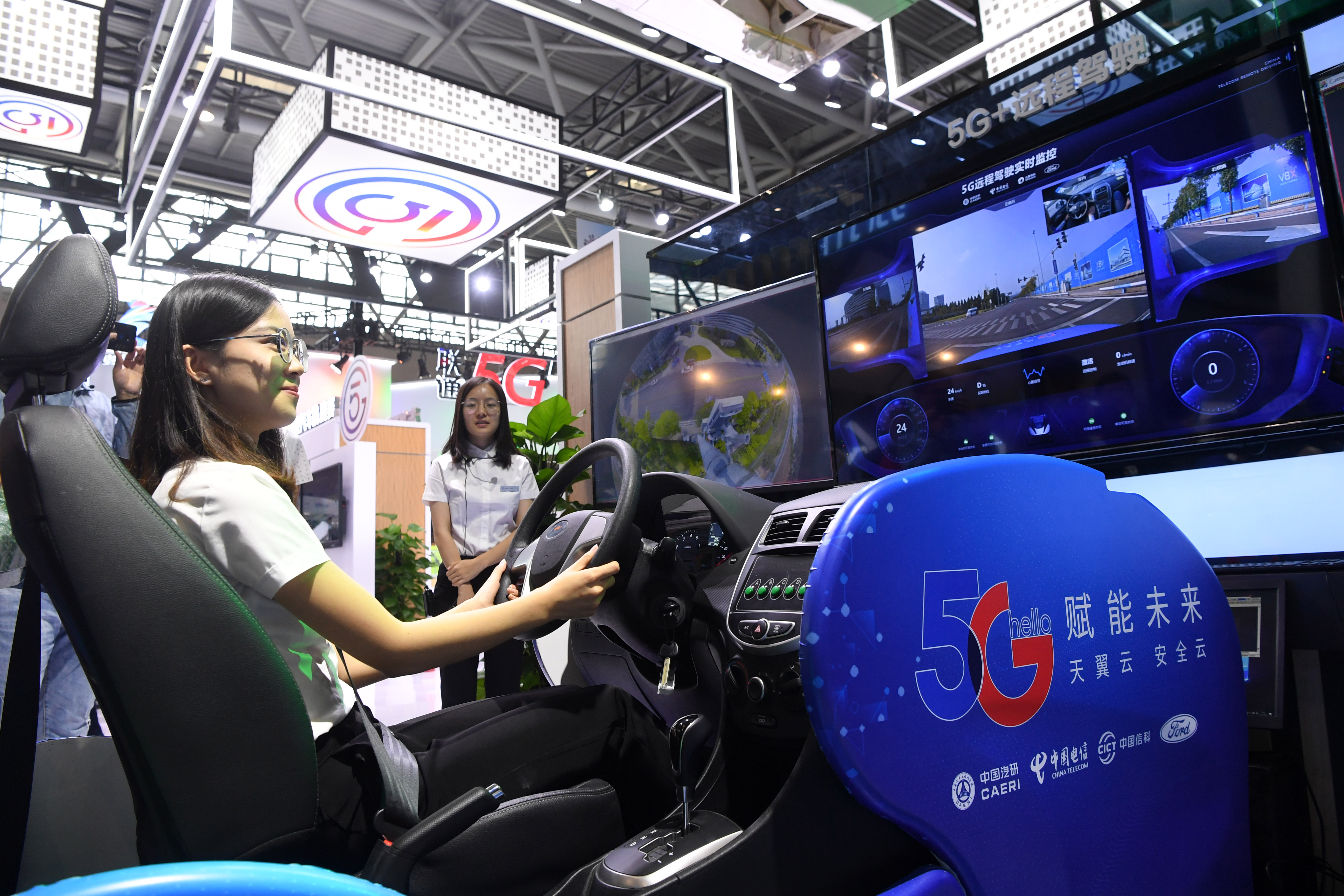 A staff member shows a 5G-based remote driving technology during the 2019 Smart China Expo in southwest China's Chongqing Municipality, Aug. 26, 2019. (Xinhua/Tang Yi)