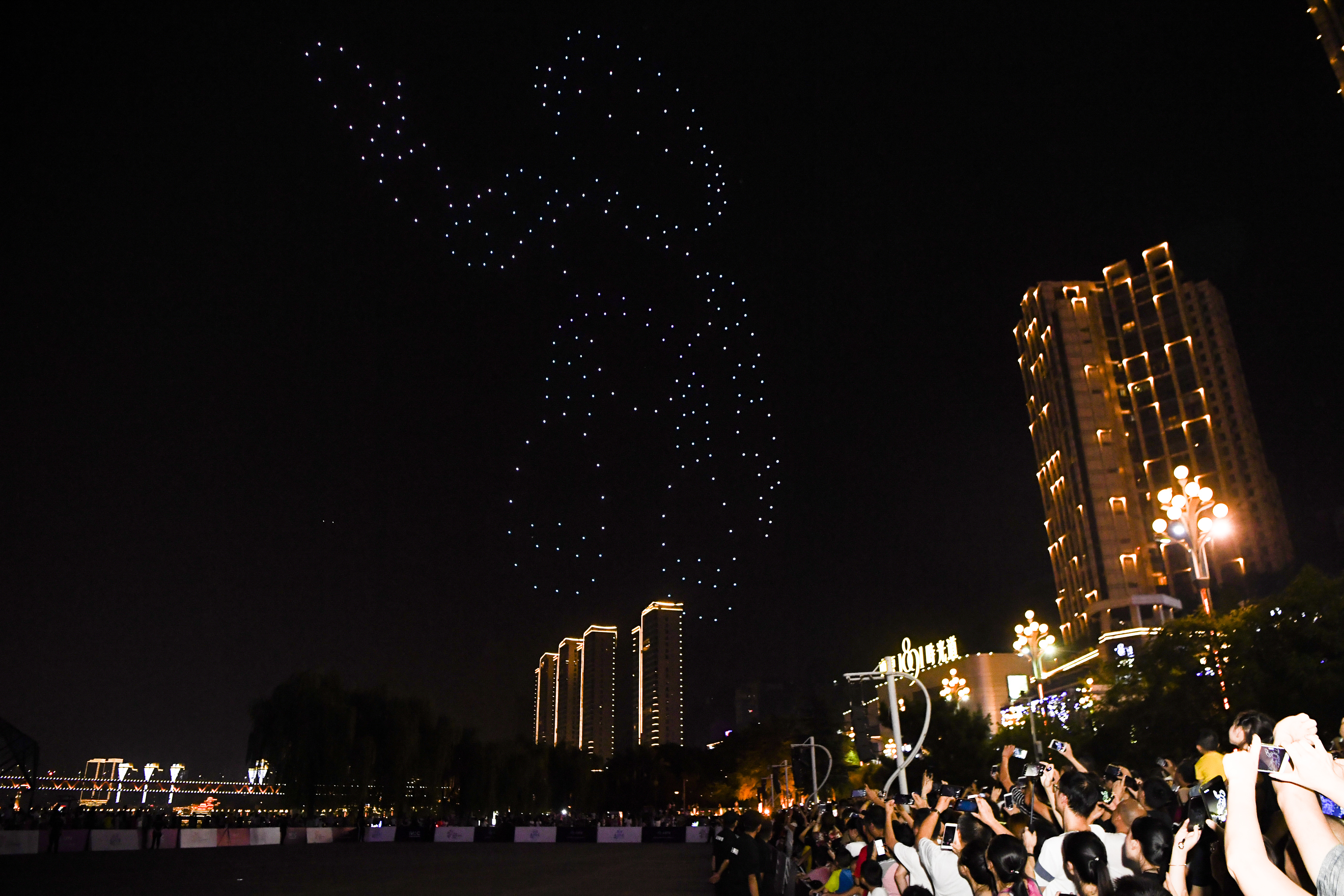 Drones make up the logo of the 2019 Smart China Expo during a drone light display in southwest China's Chongqing, Aug. 26, 2019. (Xinhua/Wang Quanchao)