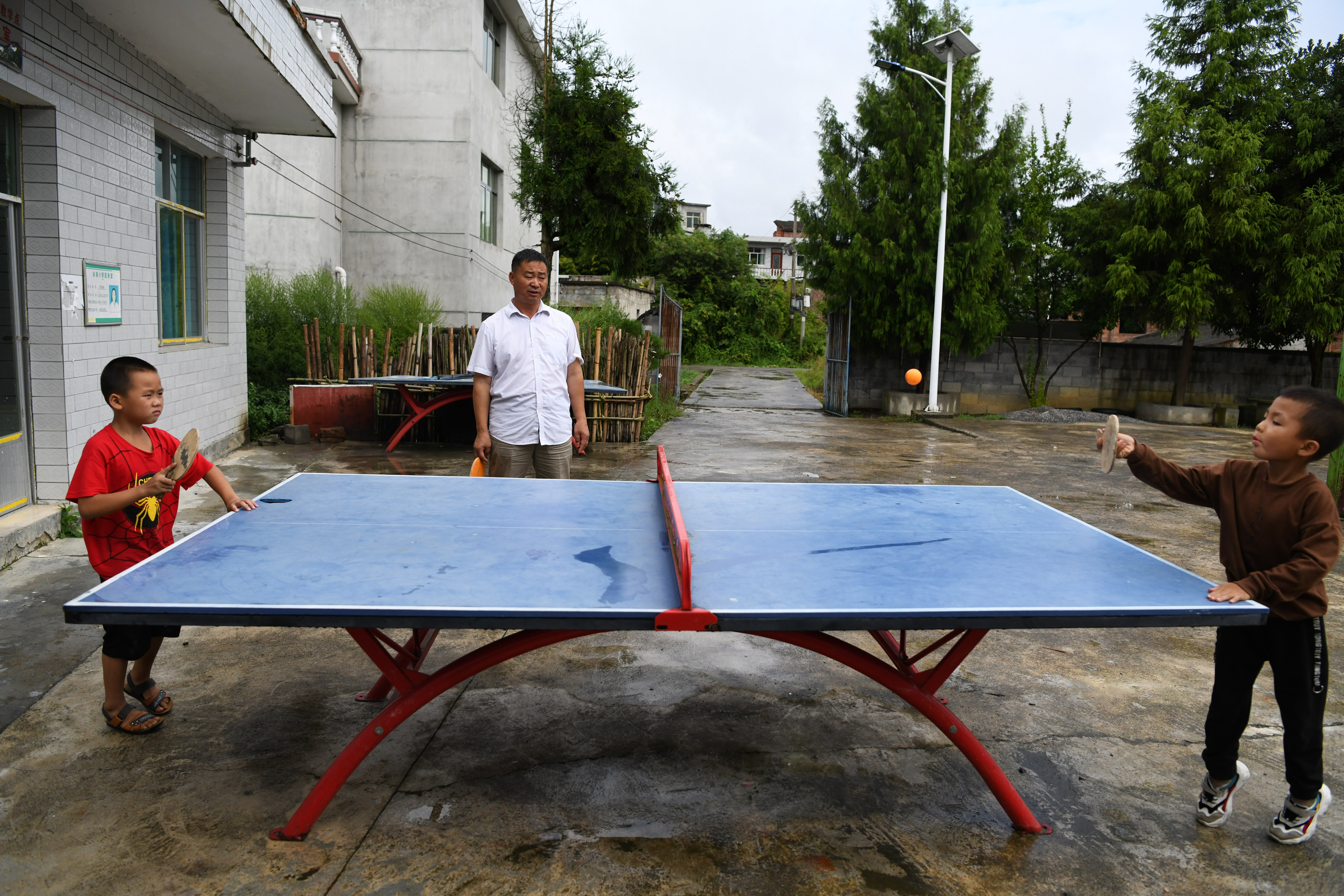 Wu Guoxian teaches students table tennis during a PE class at Gugang Primary School in Liuguang Village of Longli County in Bouyei-Miao Autonomous Prefecture of Qiannan, southwest China's Guizhou Province, Aug. 27, 2019.(Xinhua/Yang Wenbin)