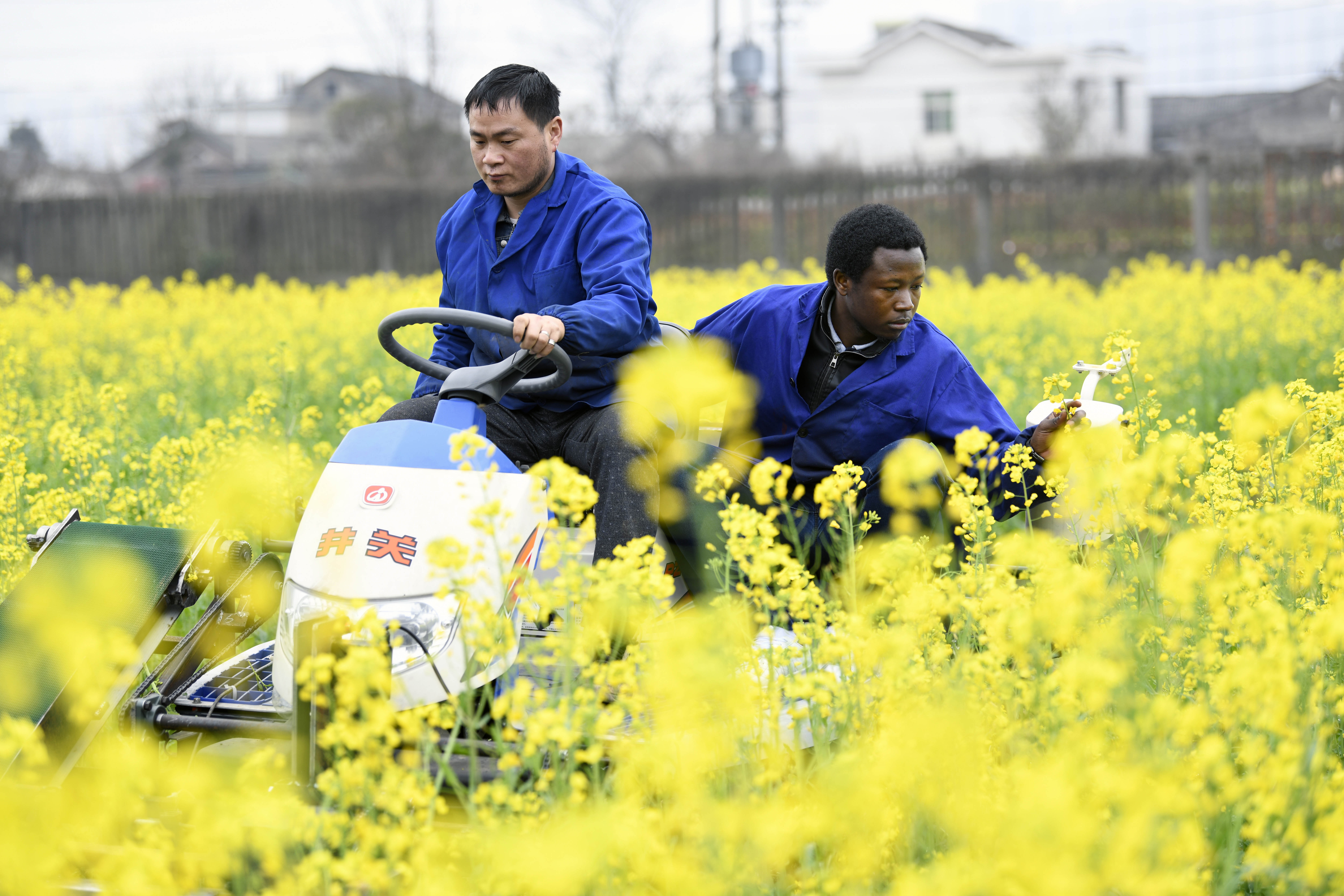 Mangeh III Fondzenyuy Cedric (R) checks the growth of plant in an experimental field at Hunan Agricultural University in Changsha, central China's Hunan Province, March 14, 2019. (Xinhua/Li Ga)